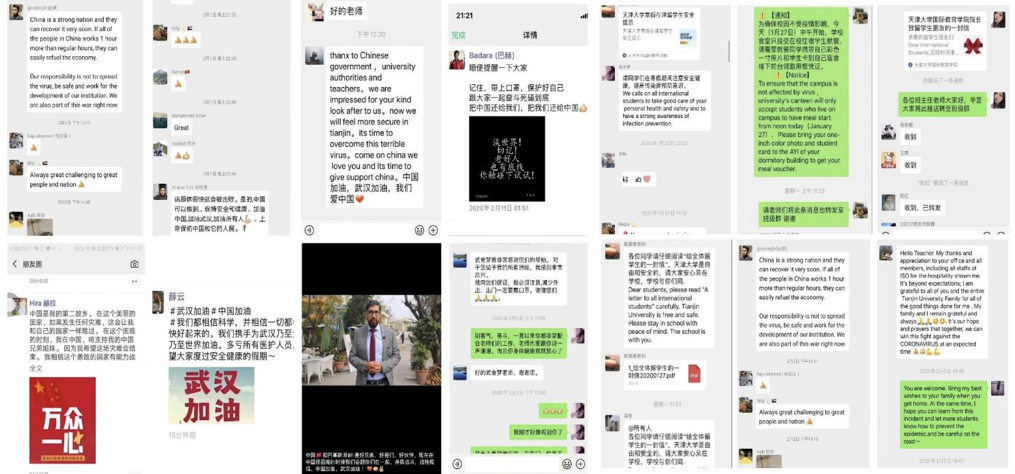 “亲爱的老师们,你们这段时间真的很辛苦,谢谢你们的关心,我希望这件事快点好起来。”“希望可以帮你们分担一些工作,你们辛苦了,你们也要注意安全。”“衷心感谢你们在疫情期间对我们所有人提供的亲切、周到和优质的关怀。我代表所有的校外学生向你们表示感谢,我们相信中国有能力也有决心尽快战胜和控制疫情。”“我感激并感谢办公室的全体老师,包括国际教育学院的全体老师对我的照顾。我非常感谢你们和天津大学大家庭为我所做的一切,我和我的家人一直都很感激。我们希望并祈祷,可以一起赢得这场对抗冠状病毒的战斗!”“我与中国的关系不仅是学习关系,而且我觉得中国是我的国家,中国人是我的兄弟姐妹。我准备好与医疗队一起帮助我的中国人民。”“我相信这个勇敢的国家有能力战胜这场灾难。”……辅导员的工作千丝万缕,在这场疫情防控的阻击战中,天津大学每一名国际学生辅导员都用自己的力量恪守着“敬业爱生”的职责,赢得了国际学生的充分理解和高度认可。病毒能隔离你我,但隔离不了爱与关怀,就像我校冈比亚籍留学生巴赫说的那样:“有学校在、有老师在,我们的希望远大于恐惧,我们会与中国、与天大的所有学生站在一起战胜这次疫情。请把中国还给我们,把我们还给中国!”(国教学院供稿\编辑 赵习钧)
