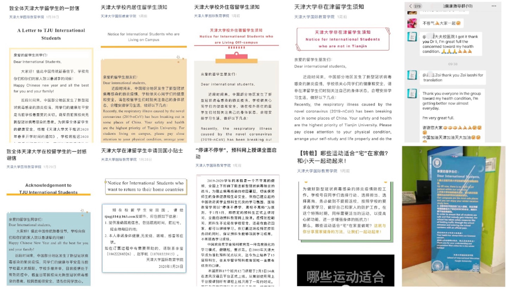 为了让大家理性认识疫情、科学自我保护,克服恐慌焦虑情绪,辅导员们靠前工作,加班加点,接连制作了多种类型的多语种宣传材料,利用微信公众平台、宣传栏等线上线下平台展示,用理性之声帮助每一位留学生提升战胜疫情的信心和勇气。面向“在校”、“在津校外住宿”、“非在津”等不同状态留学生分类管理,精准发布具有针对性的通知和提示。