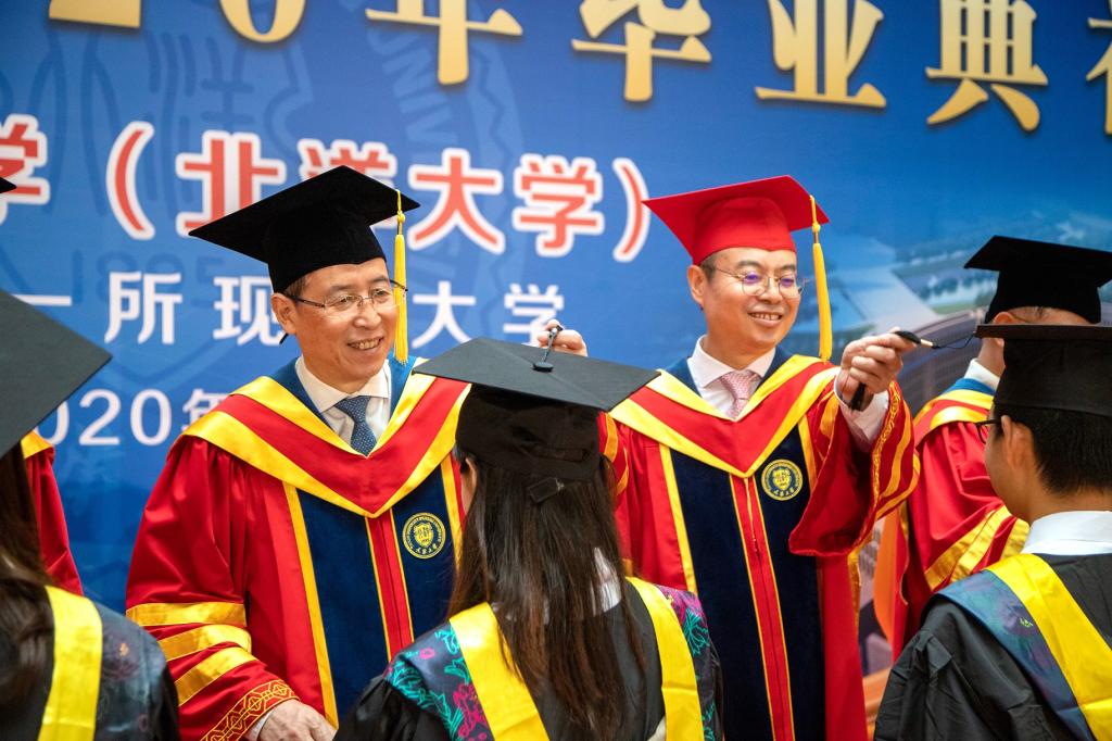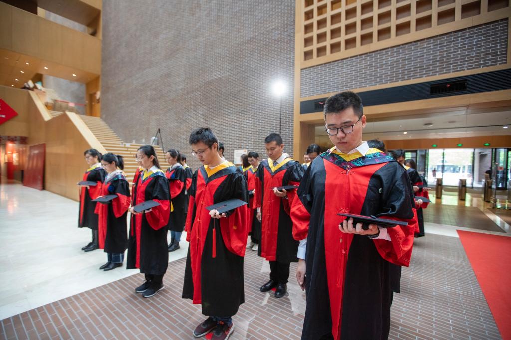 在学位授予环节,校领导为现场参加毕业典礼的数百名毕业生代表拨穗正冠。