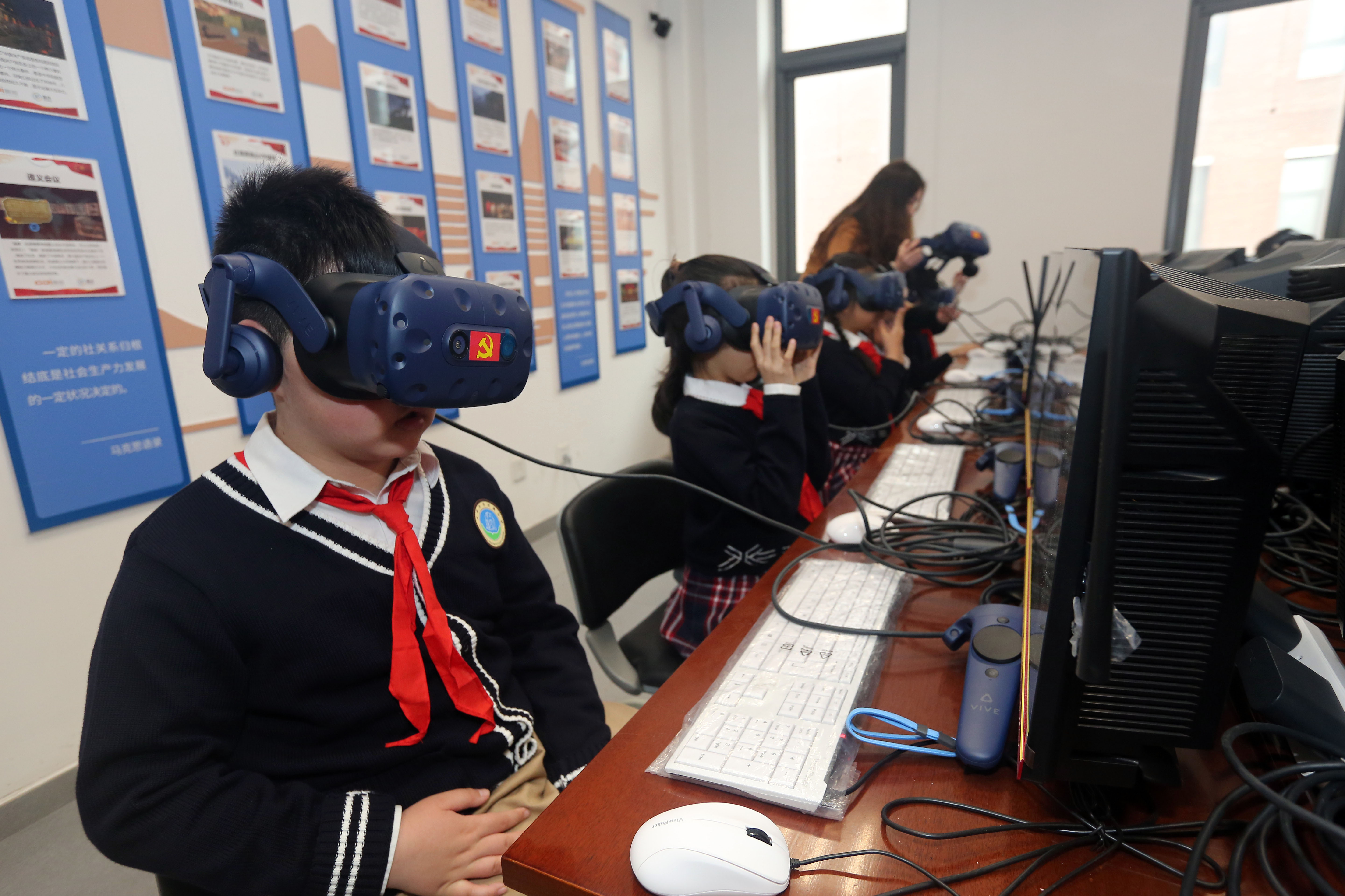 本站讯(学生记者 柳嘉澍 摄影特约记者 刘东岳)“呀,红军叔叔摔倒了!”“到处都是大雪,太冷了。”“毛主席!”在天津大学马克思主义学院的虚拟仿真教室里,孩子们戴上VR眼镜,开始了一堂别开生面的小学生思政课。3月17日下午,来自天津大学附属小学的40余名师生在这里完成了他们“百年辉煌”品牌思政课教学的第一课。