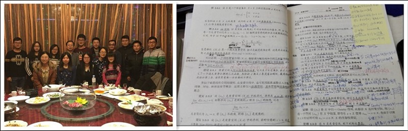 为了营造家的温暖,实验室每年会举办迎新年会及毕业生欢送会;为让大家放松身心,增强实验室凝聚力和团队合作的精神,实验室每学期初会组织集体出游。实验室的老师们每次都会与学生们玩在一起,让同学们惊叹的是金志刚教授的强大体力和技巧,每次爬山金志刚教授都会走在前面,为同学们探路的同时还不忘鼓励队伍后面的同学们坚持前进。实验室设立了“高年级带动低年级”的模式,还坚持“学习资料传递”,既节约资源,又有助于学习。照片上的应用泛函至少有五个人的注释。