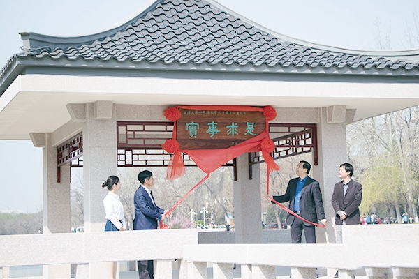北洋广场边敬业湖上的“求是亭”是1985年天大90年校庆时建成的,由彭一刚院士设计,是天大的标志性建筑。“求是亭”因年久失修,构件发生损坏,存在一定安全隐患,我校于2016年10月18日对其进行了拆除,当时引起许多师生校友关注询问。学校为保持其原状,专门聘请了建筑学院吴非老师进行重新设计,经过几个月重新建设,原貌原样的求是亭在原址上终于以崭新的面貌与师生见面。2017年4月3日,2017“天大·海棠季”期间,倍受关注的复建“求是亭”正式启用,“实事求是”匾额揭幕,“实事求是”精神代代相传。
