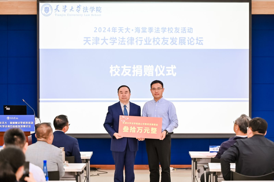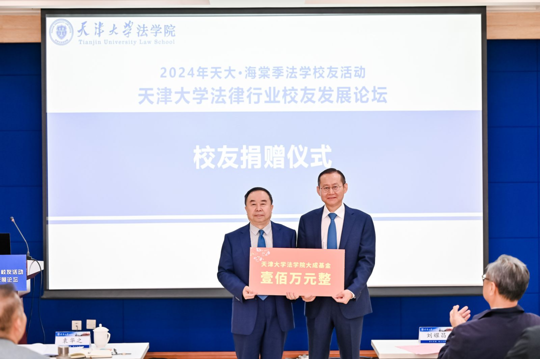 学院各项事业的发展离不开广大校友的大力支持和倾情帮助,在校友捐赠仪式上,袁华之会长以北京大成律师事务所的名义为法学院捐赠100万元成立天津大学法学院大成基金。孙佑海院长为袁华之校友颁发捐资证书及海棠季纪念品。