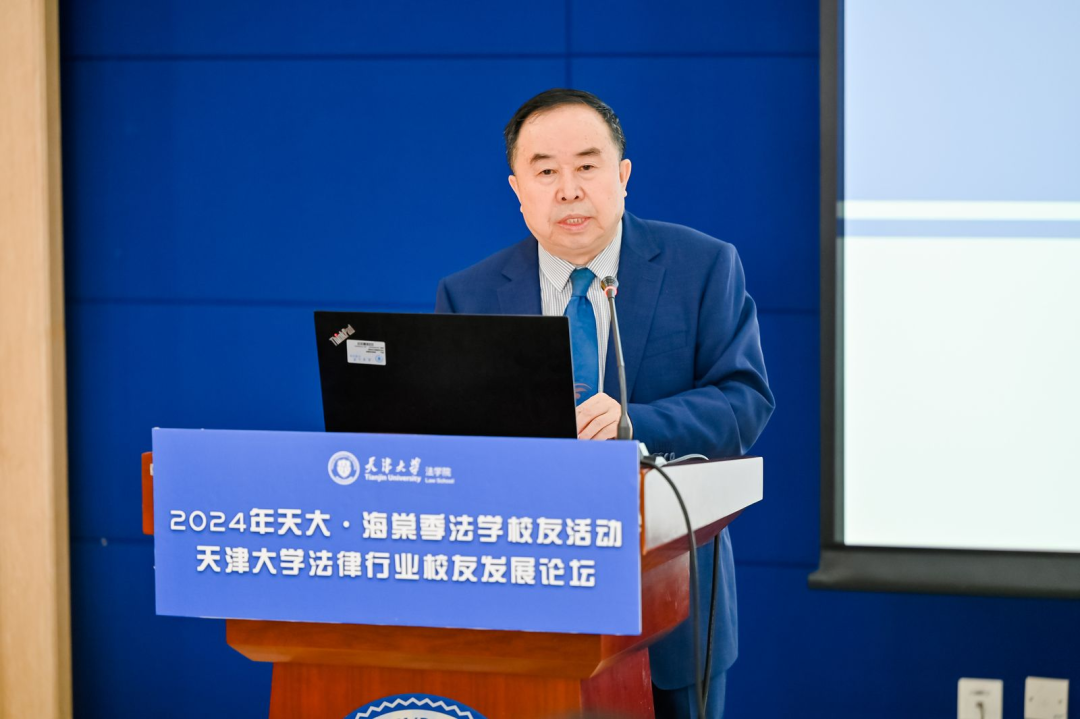 天津大学原校长助理、天津大学天津校友会党支部书记刘耀昌致辞。他代表天津校友会对论坛的成功召开表示祝贺,对主办方表示感谢,也欢迎校友们回归母校。北洋法科培养了中国共产党建党、建军重要领导人张太雷,海牙国际法庭法官中国第一人王宠惠,联合国国际法院法官中国第一人徐谟等杰出的法政与外交人才,在深厚历史底蕴的基础上不断贯彻“高起点、入主流、有特色、国际化”的办学方针,培养出一大批优秀法治人才,活跃在社会发展的各个领域。他希望校友们能将自身工作实践与母校发展紧密结合,为校友会工作给予支持和建议,努力为法治中国建设作出贡献。