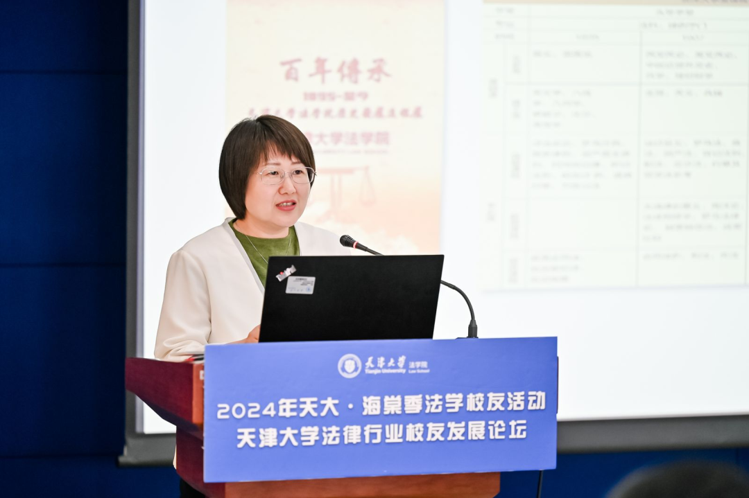 活动的第二个环节为发展报告,天津大学法学院党委书记管虹围绕学院历史沿革、发展概况、合作交流以及社会服务等方面作学院事业发展报告。