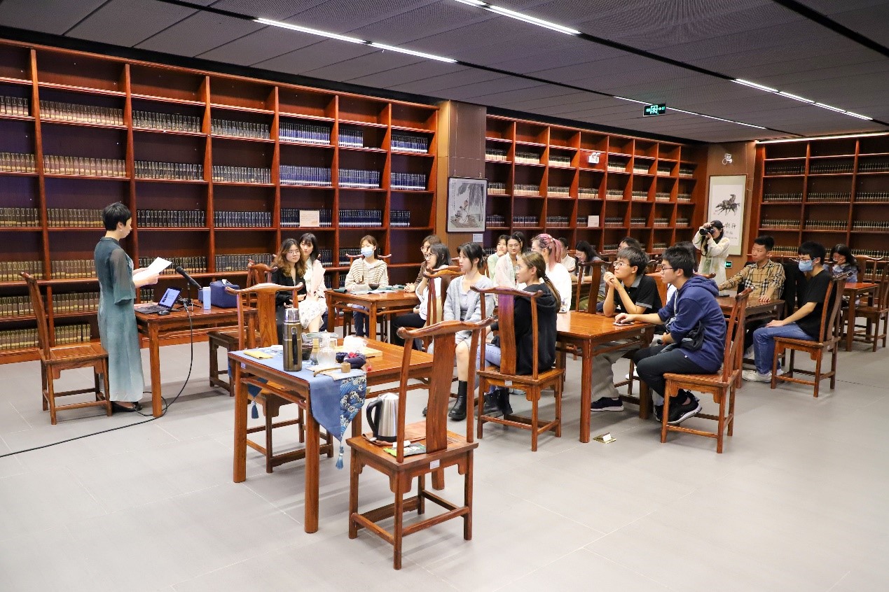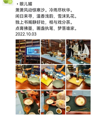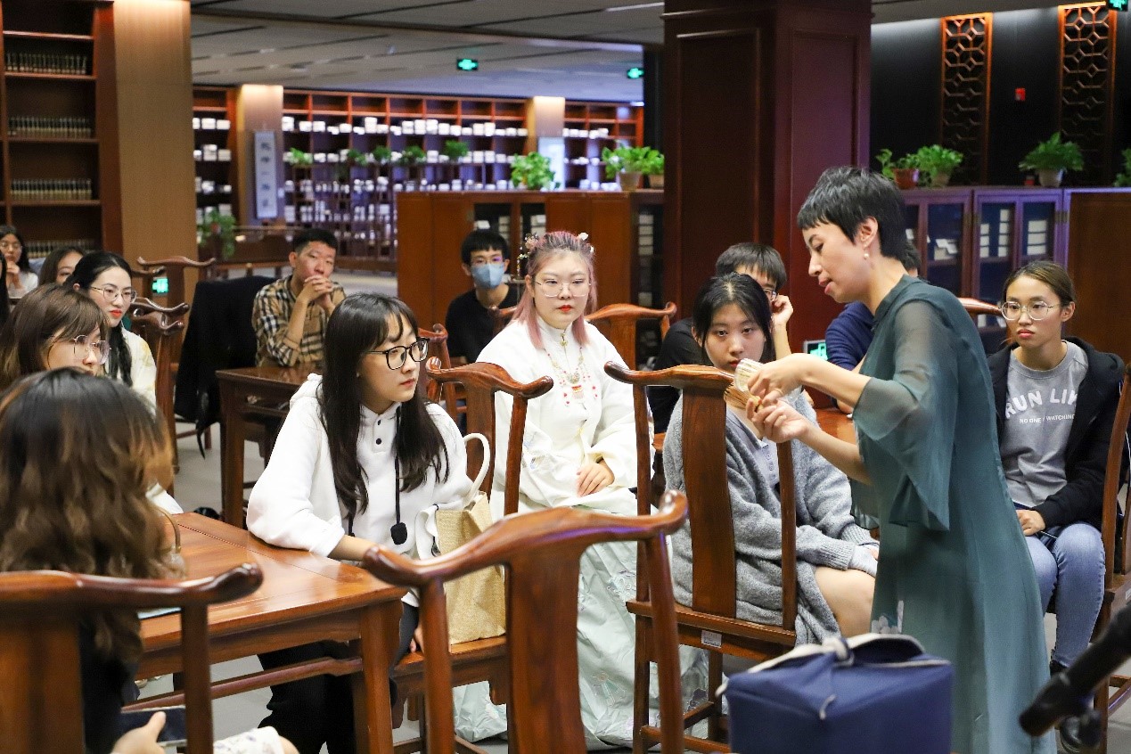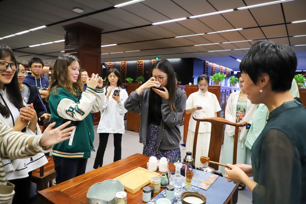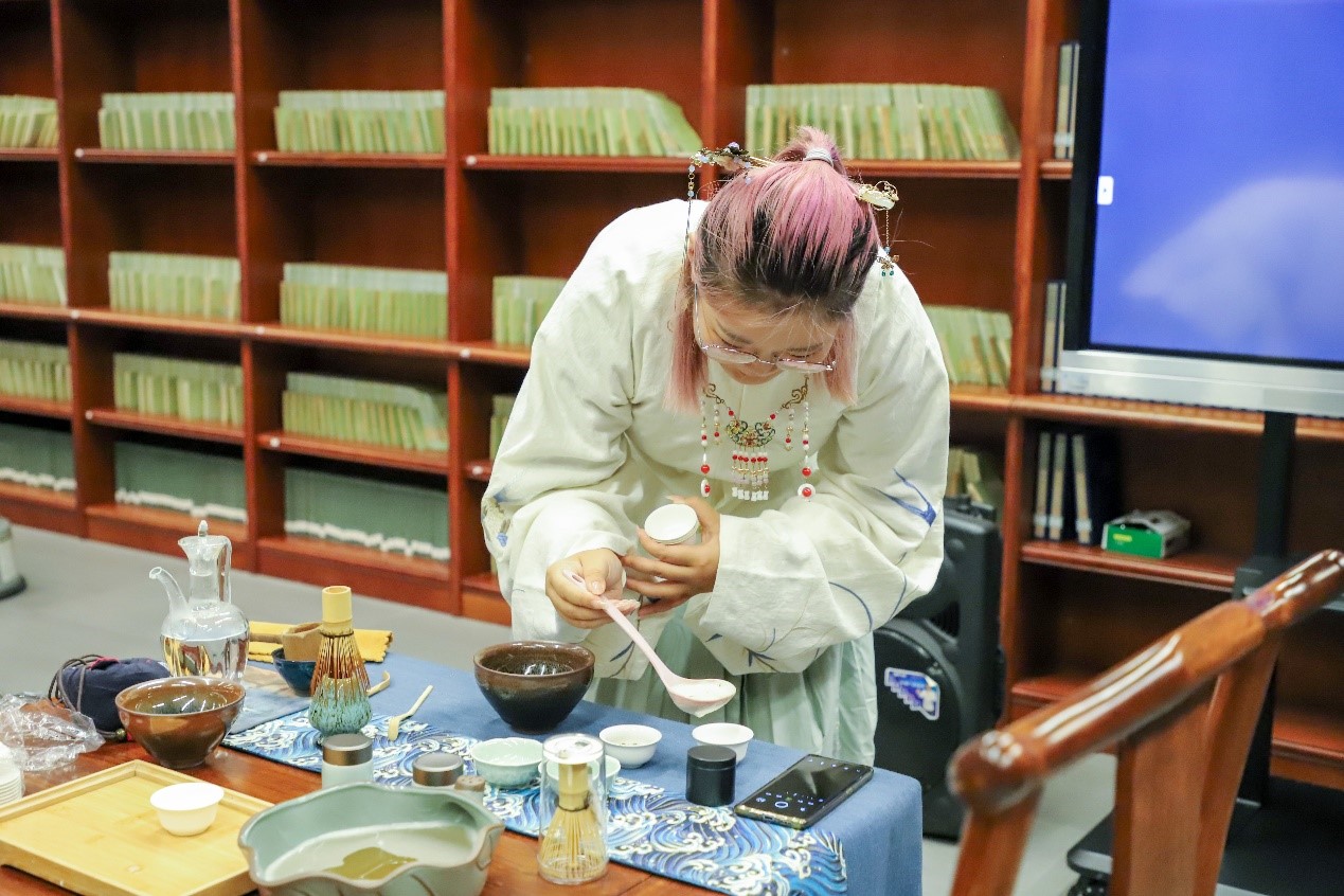 现场的同学们也亲自动手,参与到点茶的体验活动中来。喜欢汉服,对茶道这些传统文化感兴趣的人文艺术学院2019级中文专业张馨月说:“点茶更像是综合类艺术,美术书法品茶音乐形体于一体,又很强调点茶人的耐心和心静,非常好的享受慢生活慢时光的方式。非常幸运能在日新书斋这样充满古典与书卷气息的地方参加一场点茶雅集,很快乐!”