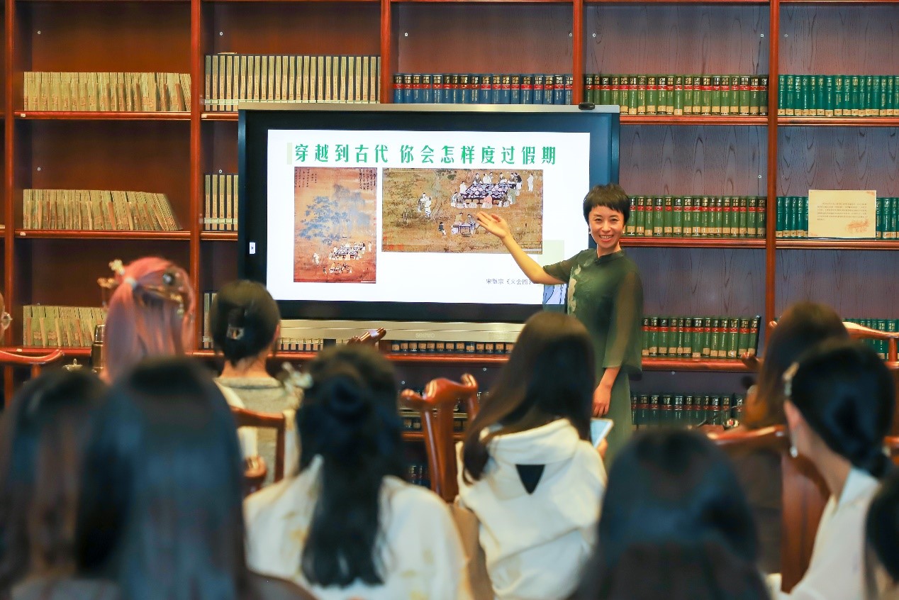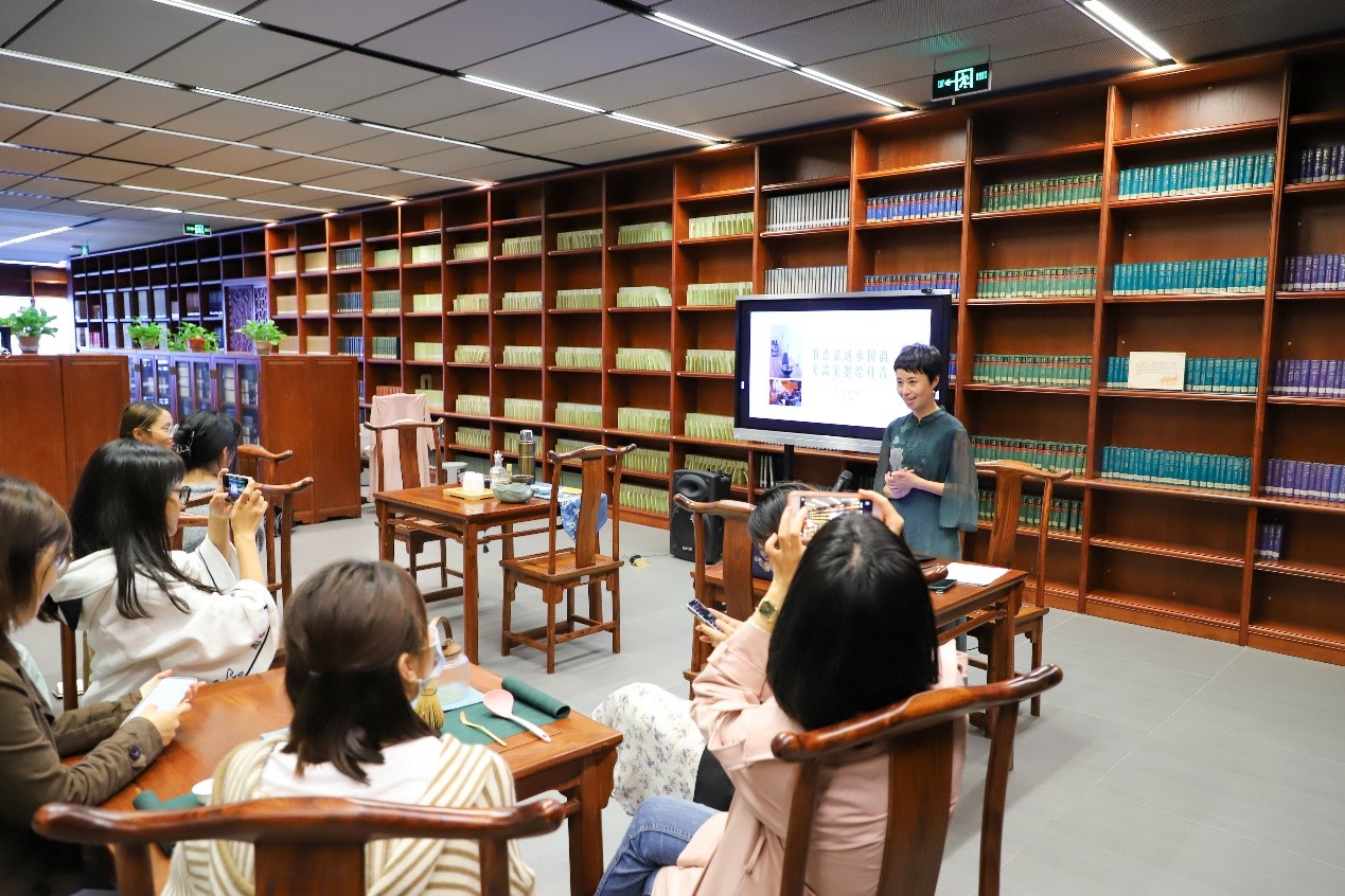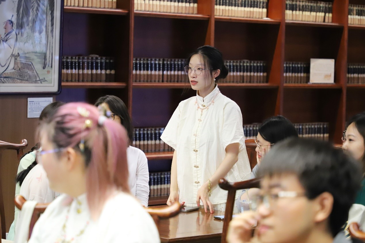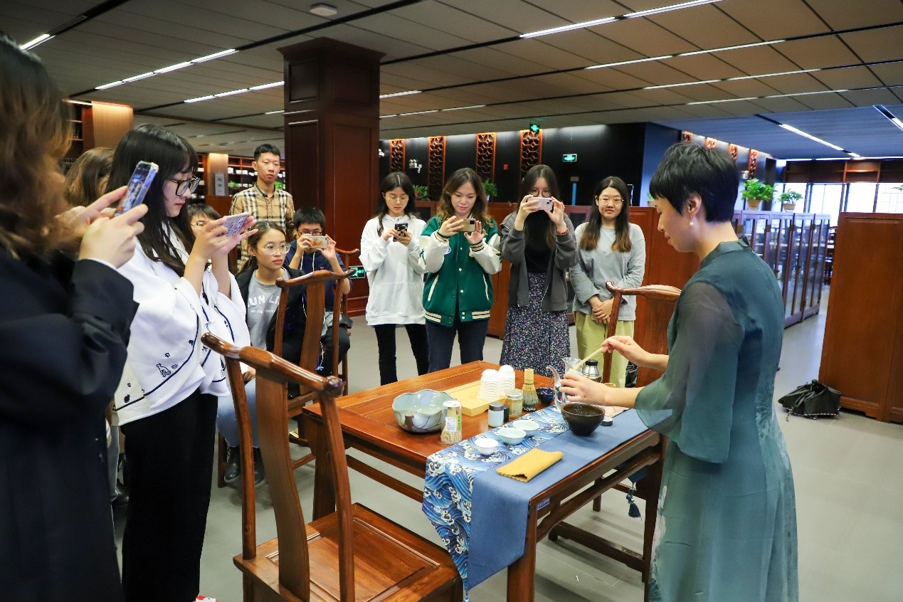 现场的同学们也亲自动手,参与到点茶的体验活动中来。喜欢汉服,对茶道这些传统文化感兴趣的人文艺术学院2019级中文专业张馨月说:“点茶更像是综合类艺术,美术书法品茶音乐形体于一体,又很强调点茶人的耐心和心静,非常好的享受慢生活慢时光的方式。非常幸运能在日新书斋这样充满古典与书卷气息的地方参加一场点茶雅集,很快乐!”