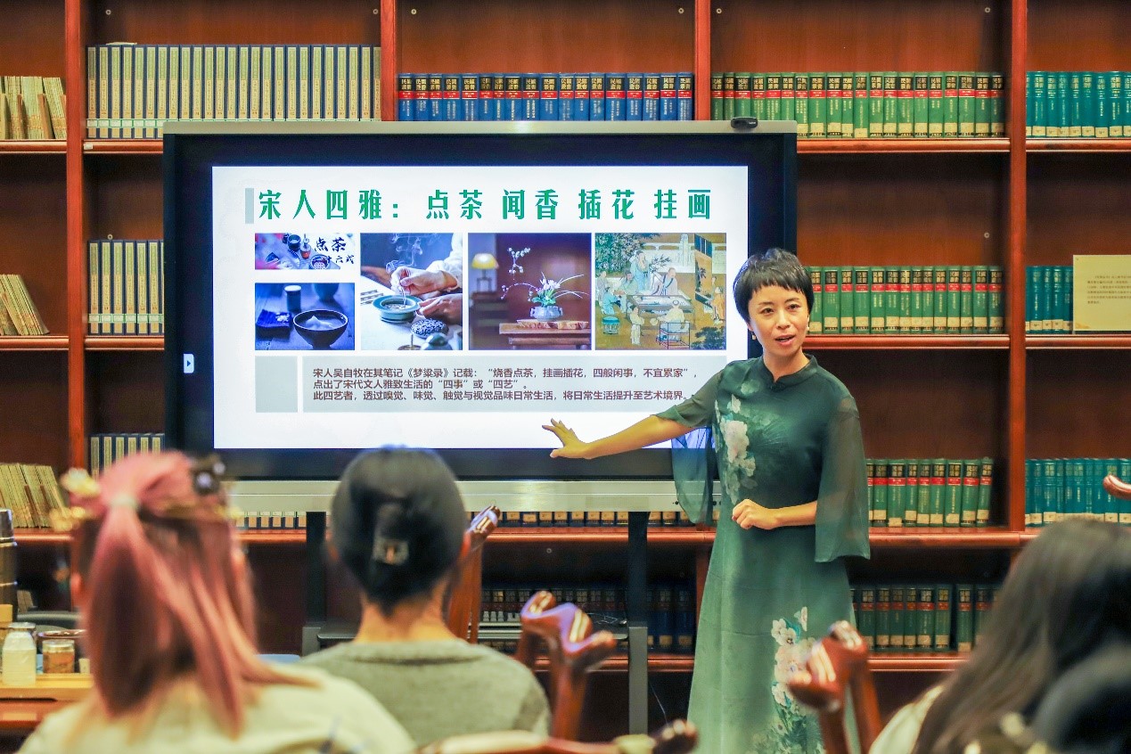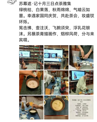人文艺术学院党委书记吕静老师与同学们从电视剧中的点茶情节开始说起,向同学们介绍了宋人流传至今的点茶文化,介绍点茶流程,并亲自演示了点茶流程。