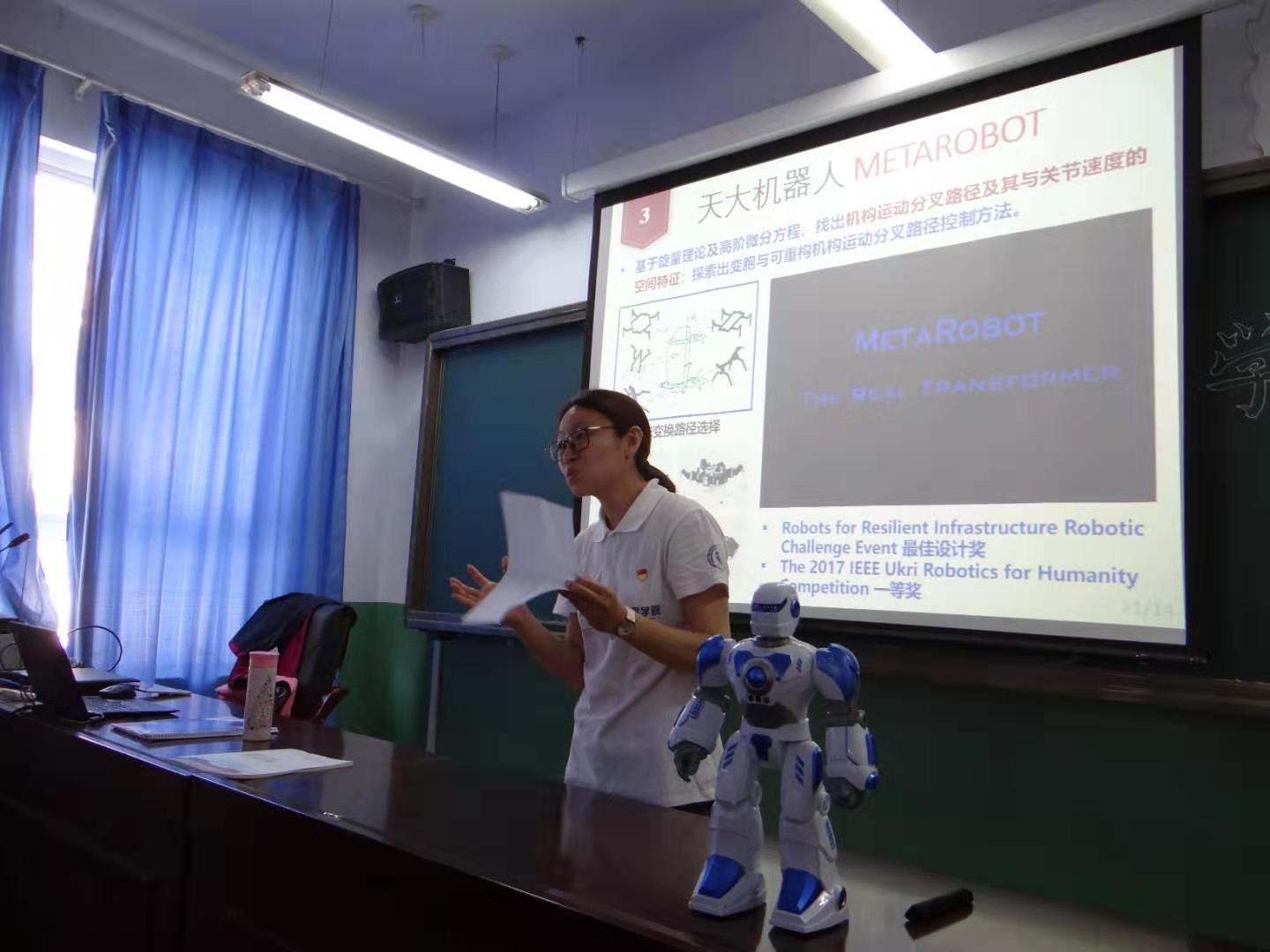 邀请天津大学科普团教师邢元讲授机器人的功能与应用,手舞足蹈的机器人助教让学生们真实触碰到科技改变未来的力量。