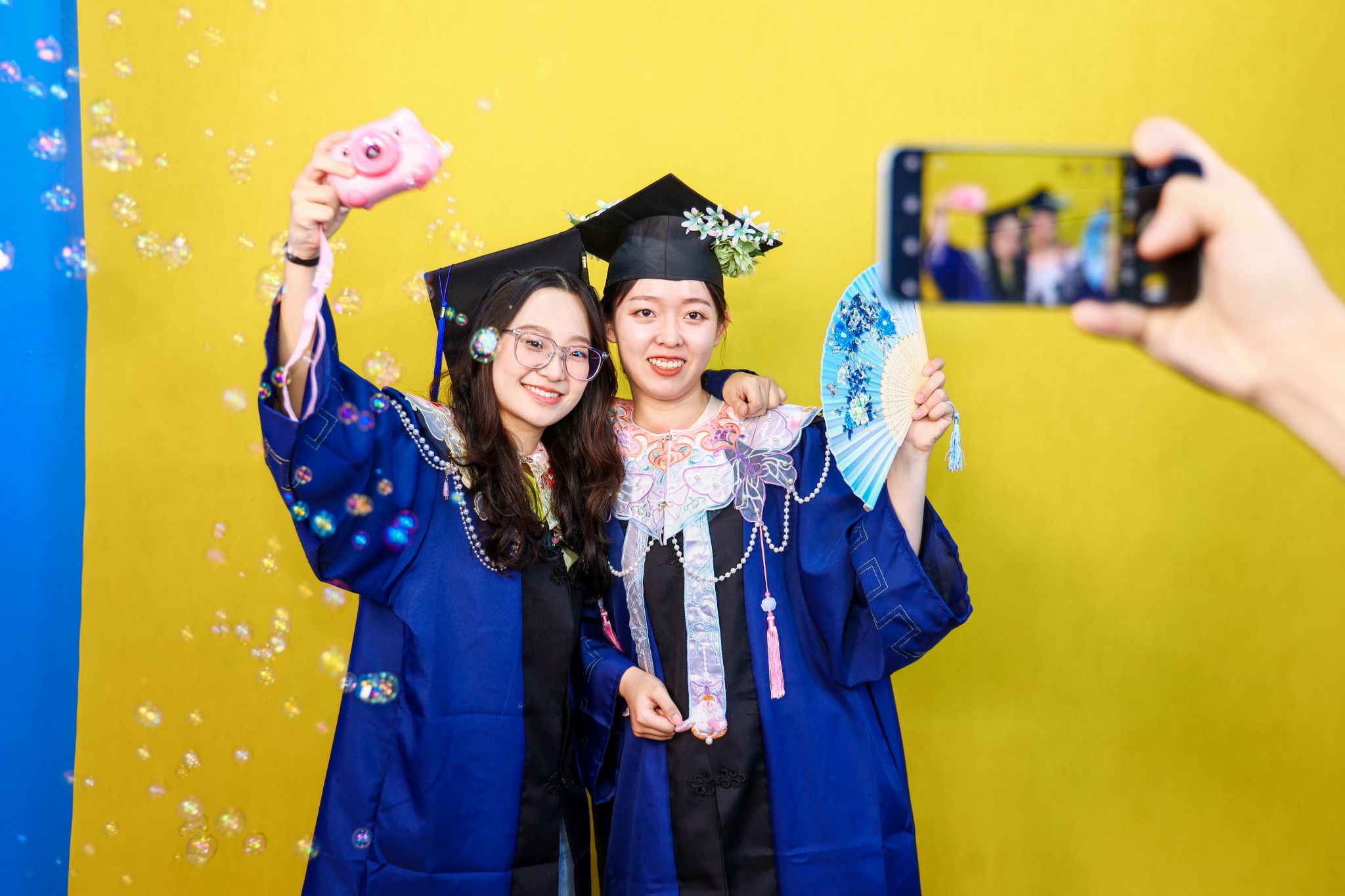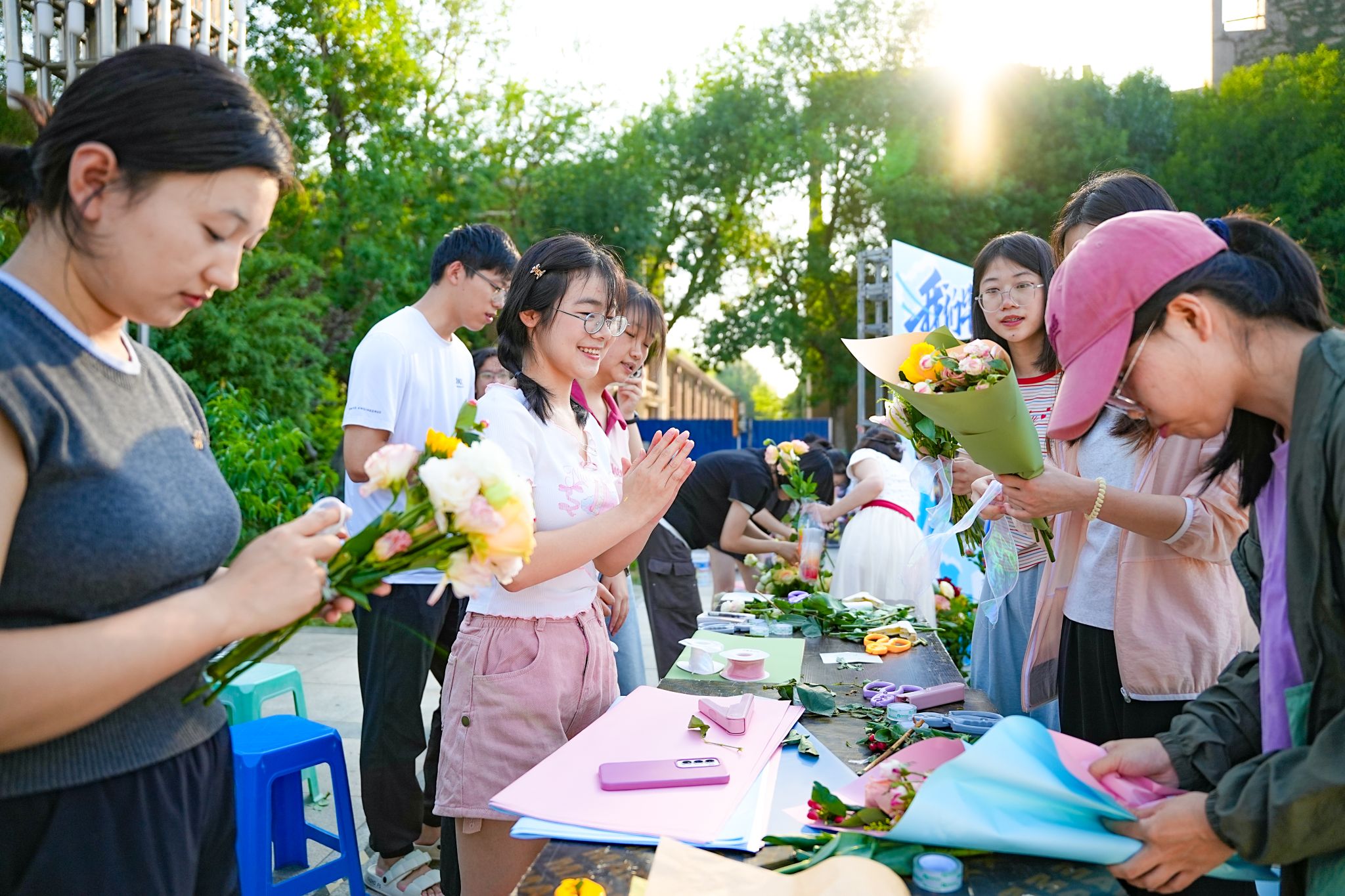 卫津路校区的毕业市集上,建筑学院毕业生张家玮戴着手绘学位帽在打卡墙前留影:“就像这个帽檐上勾勒的北洋大学堂和校训石,我也要带着‘实事求是’去工作。”花束DIY摊位前,毕业生们用向日葵与满天星扎成花束送给师友同窗。空气中的花香与笑语无不洋溢着天大毕业季的温情氛围。