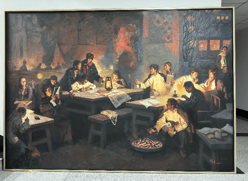 西北工学院办学条件非常艰苦,七星寺分院更是没有通电。一心求学报国的北洋师生就靠着蜡烛和小油灯的微弱火光通宵苦读。点点滴滴的灯光彻夜不熄,被称为“七星灯火”。下面这幅油画描绘的就是北洋学子在七星寺彻夜苦读的情景。