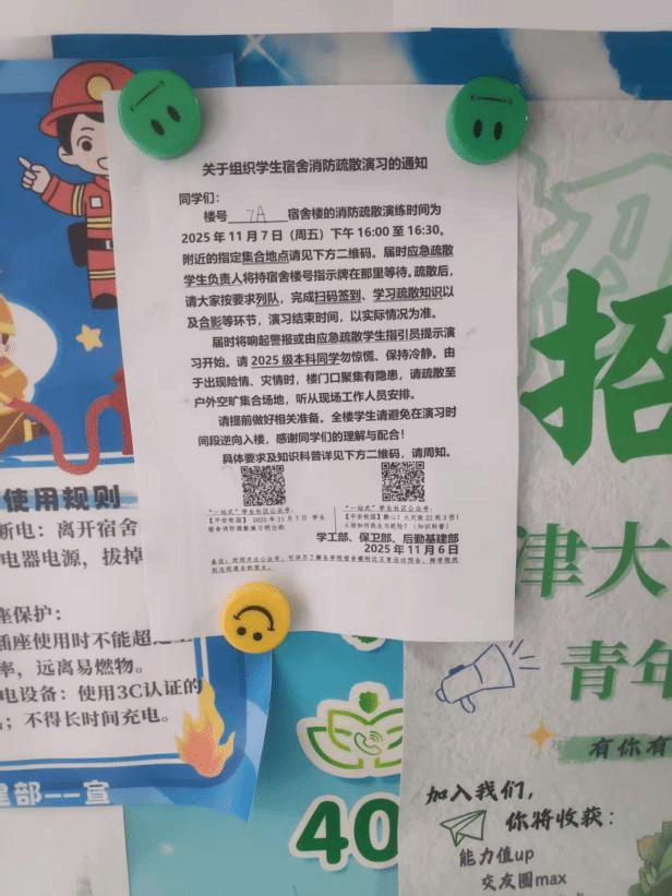 演习前夕,各部门分工合作,通过在办公网以及宿舍楼内发布通知通告、辅导员告知、新媒体宣传等方式,提前广泛宣传消防疏散工作安排、疏散注意事项,安排专人前往演习现场,负责统筹协调和应急处置。各单位制作疏散工作预案,明确职责分工,做好宿舍楼内消防设施设备检查工作,保障疏散通道畅通。