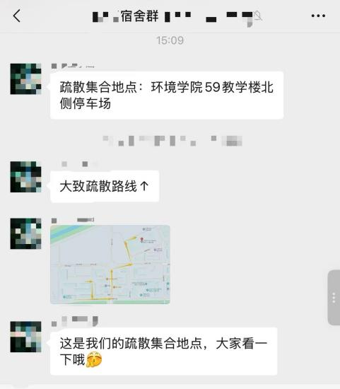 本次演习创造性地设立“三主”模式,即“学生主体、全程主导、发挥主人翁作用”,疏散过程无需学院辅导员组织。学院(部)事先在每栋宿舍楼内明确三名应急疏散学生负责人,与各楼层应急疏散指引员协同疏散楼内学生。各宿舍楼应急疏散负责团队主动检查走廊、楼梯及各应急出口是否堆积杂物,在宿舍群内发布疏散通知,用喊话器提前录制疏散提示,有的学生负责人更是做到细致入微,告知需跑出宿舍一段距离,以防通道堵塞。