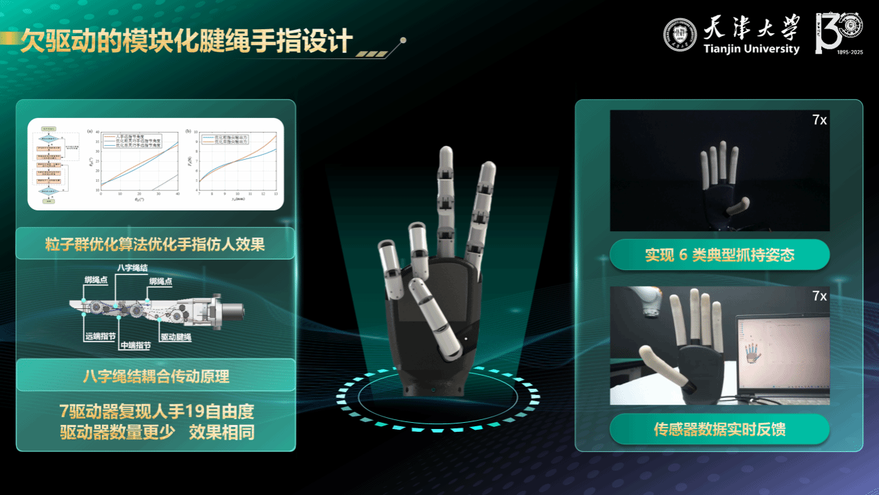 《智行合一——引领机器人运动智能未来》项目由具备不同专业背景和技能的成员组成,具备丰富的创业经验和专业知识,由戴建生院士、康荣杰教授领衔指导。项目面向人形机器人末端操作领域,打造出多款重量尺寸小、操作精度高、抓持适应性好的仿人五指灵巧手。灵巧手采用欠驱动的模块化腱绳手指设计和八字绳结耦合传动原理,运用粒子群优化算法优化手指的仿人效果,使用7个驱动器复现人手19自由度的运动,在减少整机重量尺寸的同时保证灵巧手的灵活性。