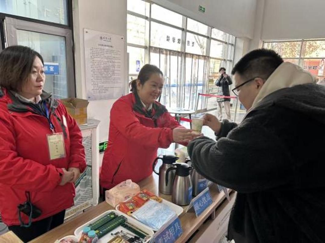 学校着力营造温馨考场环境,为考生传递温暖与关怀。考前安排专人全面保障供热与供电系统,细致排查教室桌椅、窗帘、钟表校准、卫生间设施及校园铃声系统,并对考场区域进行通风消杀。考场楼入口处为考生贴心准备了红糖姜茶、2B铅笔、签字笔、糖果、小食品、咖啡等暖心物资,以细致服务传递来自天津大学的诚挚祝福。学校还在两校区食堂特别开辟考生专用绿色通道,设置休息区域,并延长部分窗口午餐供餐时间至14:00,打造“研”途食力补给站。食堂在考研期间全面开放便捷支付方式,方便校外考生快速就餐,着力营造舒适的用餐环境。学校积极倡议校内师生错峰就餐,为考生预留充裕的用餐时间与空间,全方位做好考试期间后勤保障。各学院也以多种方式为研考考生鼓气加油。