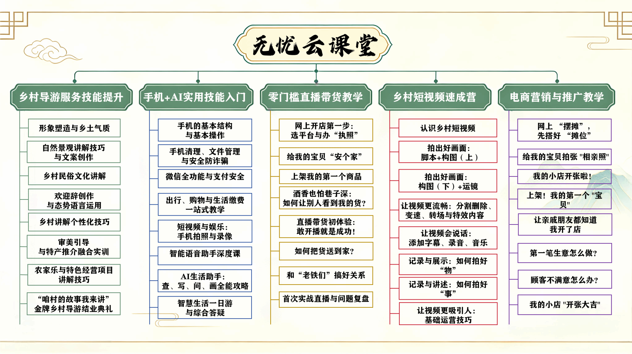 在湖南桂阳,电商人才短缺的问题成为当地数字经济赋能实体经济的障碍。实践队联合当地团委启动电商人才“双轨培育”政校合作项目,以“线下授课+线上推广+无忧云课堂资料库”为核心,构建起覆盖“入门-进阶-长效”的系统化培训体系。线下,集中科普聚焦“手机+AI实用技能、直播运营、短视频创作、电商营销”四大模块,精准对接基层发展需求;线上,锚定切实需求打造“无忧云课堂”,通过微信小程序上线“进阶”学习内容,打破时空限制,让学员可随时学习。该项目为当地培育了一批留得住、用得上、懂技术的电商实用人才,推动电商与本土特色产业深度融合。
