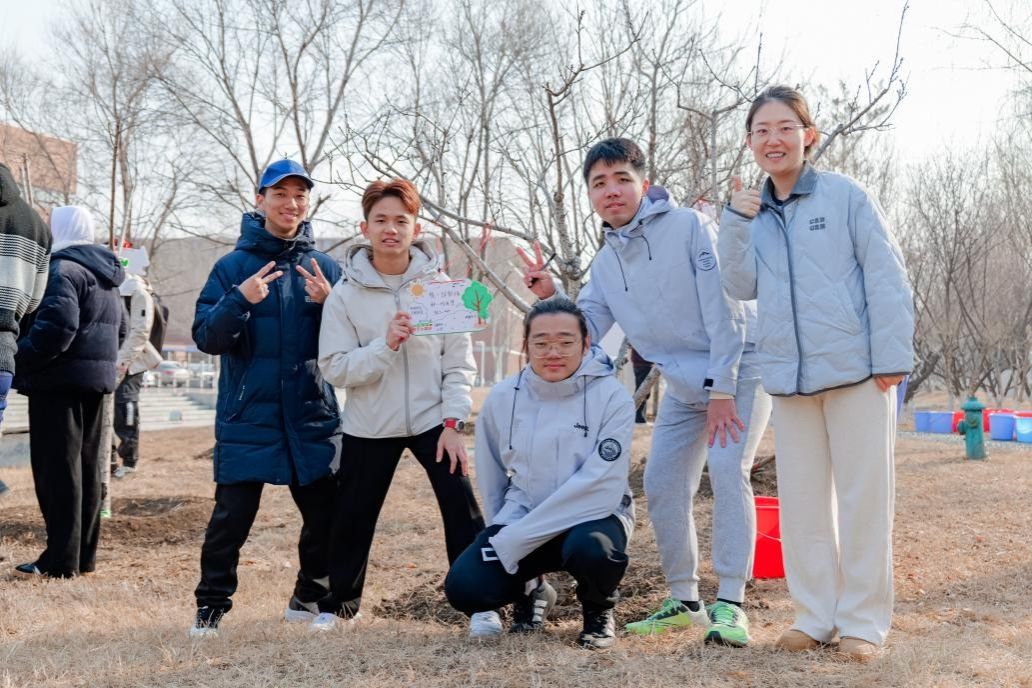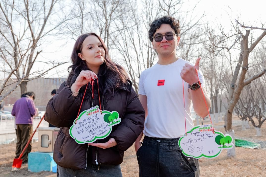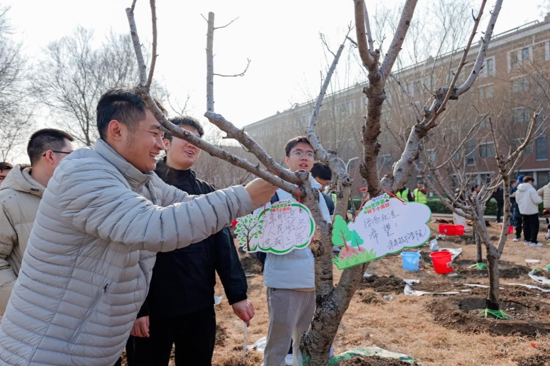 活动现场,大家充满热情,跃跃欲试。在后勤基建部教师为大家详细讲解树木种植和养护的专业方法后,中外师生多人成组开展植树劳动,现场气氛热烈而有序。来自俄罗斯、巴基斯坦、马来西亚等11个国家的留学生与中国的老师同学们一起,挥锹铲土、扶苗填坑、提水浇灌,大家相互协作、彼此帮助,共同种下了这片“友谊林”。通过此次植树活动,中外的天大学子们以劳动实践为载体,在协作中凝聚青春合力,共同守护绿色家园,携手书写中外青年友好交流的新篇章。待苗木种下后,“添绿北洋园 种下小美好”的寄语环节将现场氛围推到新的高潮。师生们纷纷拿起笔,写下自己的心愿寄语。“愿小树茁壮成长,愿我们不负春光”“愿中外情谊如松柏常青”“Best wishes to Tianjin University, Best wishes to China”…… 一句句话语,既有对新学期的憧憬、对生态保护的坚守,更饱含着中外师生对彼此情谊的珍视,让这片友谊林成为美好期盼与跨国情谊的双重见证。