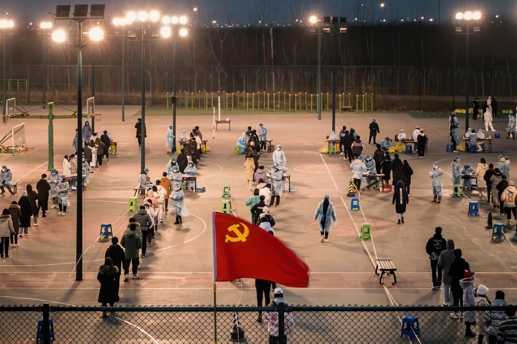 张铜身后,是无数步履匆匆、引导师生有序入场、快速检测的志愿者们。北洋园校区的体育场上,一面面鲜红的党旗正迎着猎猎寒风,傲然翻飞,高高飘扬。
