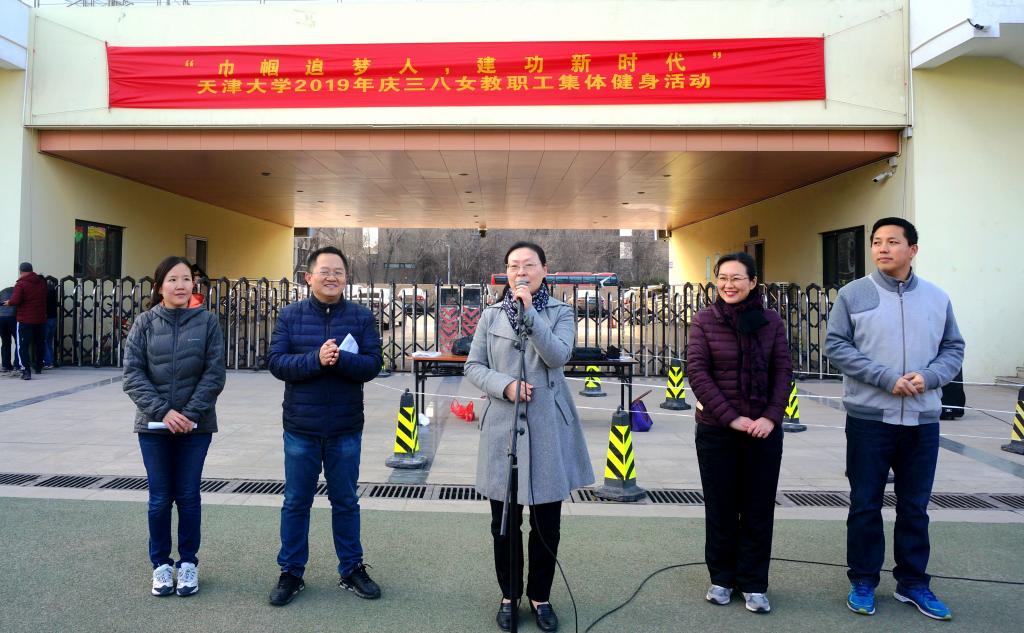 本站讯(通讯员 于婧)3月6日,为庆祝第109个“三八”国际劳动妇女节,倡导女教职工“快乐工作,健康生活”,校工会组织开展了天津大学2019年庆三八女教职工集体健身活动。本次活动得到了全校女教职工的积极响应和广泛参与,包括全国劳模、天津市三八红旗手在内的来自32个院级单位工会的近千名女教职工参加了活动,规模为近几年之最。校党委副书记、工会主席、组织部长、统战部长赵美蓉出席活动并致辞。