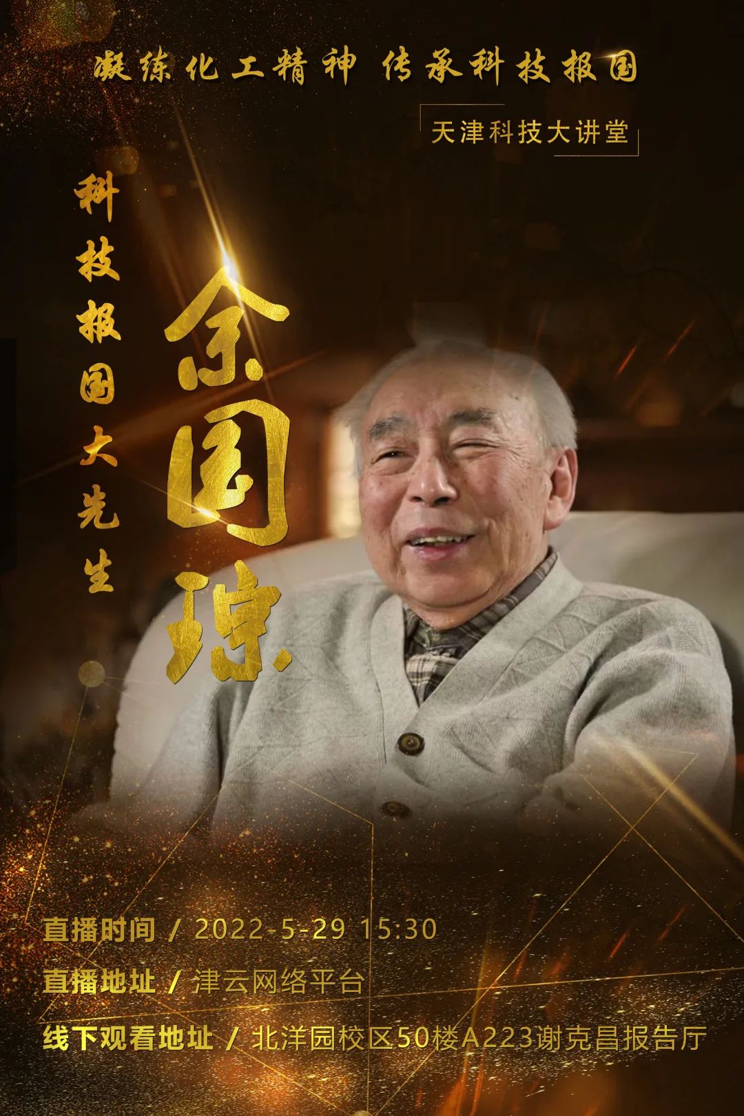 在第六个全国科技工作者日到来之际,以弘扬科学家精神为主题的《科技报国大先生——余国琮》节目将亮相“天津科技大讲堂”,节目将于5月29日下午3点半开始,届时将通过津云网络平台进行线上直播,北洋园校区50楼A223谢克昌报告厅将进行线下同步直播。