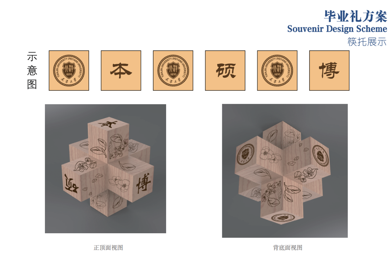 筷子托上雕刻海棠花图案、校徽及本硕博字样。悄悄告诉你,筷子托还是件智力玩具,本硕博三个托可以通过榫卯结构,组成 “好汉锁”。 获得不同学位的毕业生可以拿出来组合,玩一玩。而这个过程也是母校对毕业生的期许——凝心聚力、共扬校誉无穷。