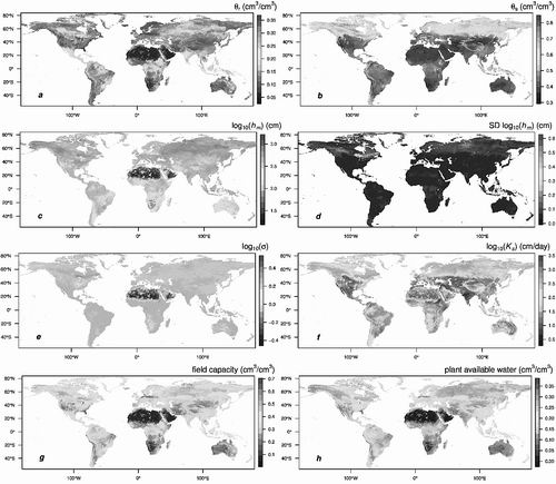 全球表层土壤1km网格土壤水力参数 (a)残余含水量,(b)饱和含水量,(c)压力水头中位值(取log10),(d)压力水头中位值(取log10)的方差,(e) 压力水头的方差(取log10),(f)饱和渗透系数,(g)田间持水量,(h)植物可利用水分。
