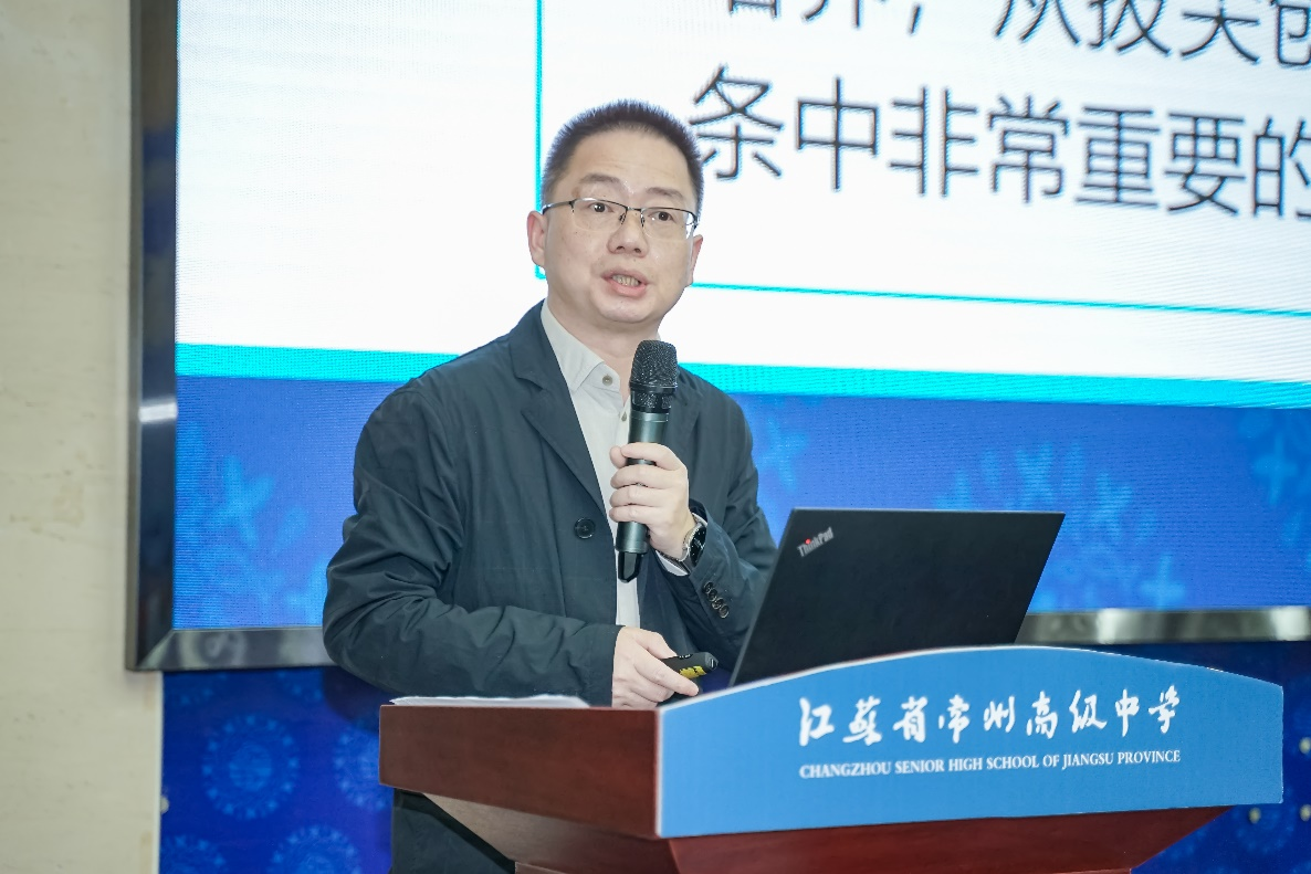 江苏省常州高级中学校长曹新跃带来《在课程选择参与中发现潜能、发展特长》的报告。曹新跃介绍了江苏省常州高级中学拔尖创新人才“选才-育才-成才-用才”的培养体系、学校在该人才培养体系下取得的优异成绩以及江苏省常州高级中学学生在各方面取得全面发展,成为服务社会的高素质人才。