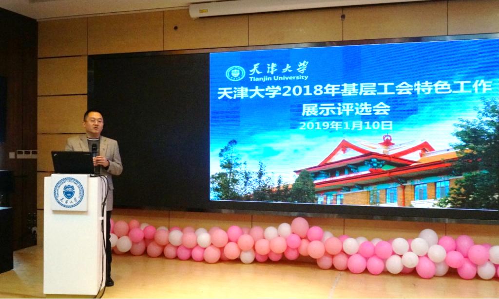 本站讯(通讯员 温锌勇)1月10日,天津大学2018年基层工会特色工作展示评选会在卫津路校区教职工文化活动中心举办,校工会常务副主席马桂秋,兼职副主席于晓燕、王喆,挂职副主席陈乐、姚卫东以及全校32个院级单位的工会主席、教代会主任参加会议。会议由校工会副主席陈宝禄主持。