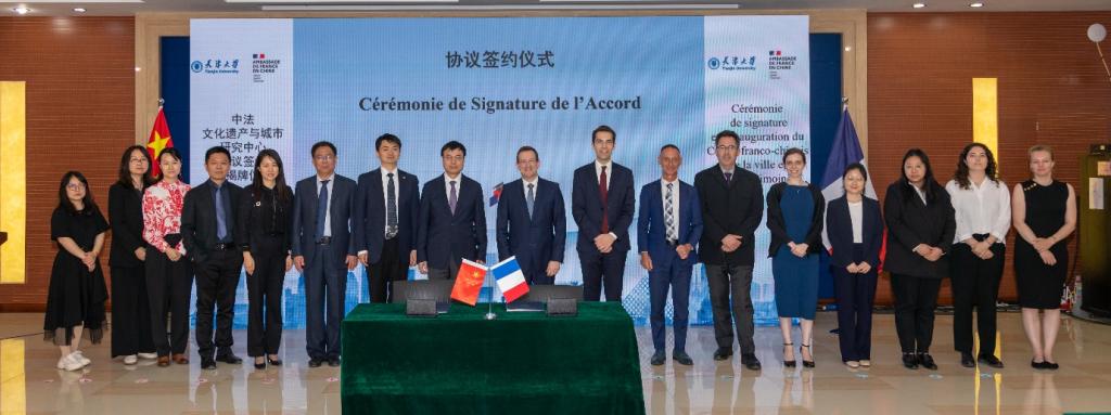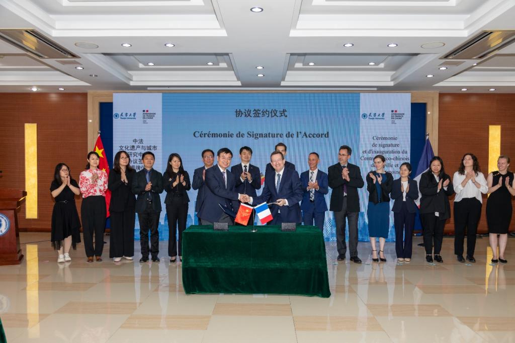 随后,双方签署协议并举行揭牌仪式。中心的正式成立标志着天津大学与法国使馆新时期合作征程的正式启航,双方将积极共建多样的合作项目,欢迎专家学者提供指导和帮助,聚焦共性问题,积极探索文化遗产保护利用新路径,打造世界遗产保护利用新典范。