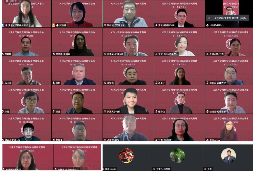 本站讯 2月2日下午,天津大学网络空间国际治理研究基地(以下简称“基地”)第一次工作会议在线上举行。天津大学副校长郑刚,统战部部长、人文社科处处长张俊艳,基地负责人、天津大学新媒体与传播学院院长陆小华,法学院院长孙佑海,国际合作交流处副处长胡清华,生物安全战略研究中心主任张卫文,天津大学新媒体与传播学院党委书记王赞,管理与经济学部MPA中心主任陆明远以及相关单位负责同志、相关学科领域学者参加了本次会议。会议由张俊艳老师主持。