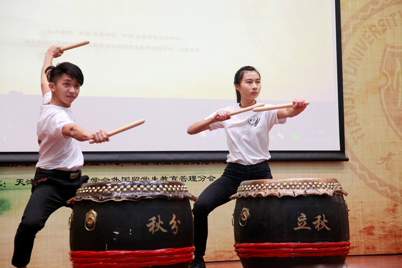 马来西亚留学生林子筠携同伴带来了马来西亚非物质文化遗产——二十四节令鼓,气势恢宏、声震寰宇,展示了马来西亚华裔远离故土,传承中华文化、不忘节气、不忘根源的中华情。