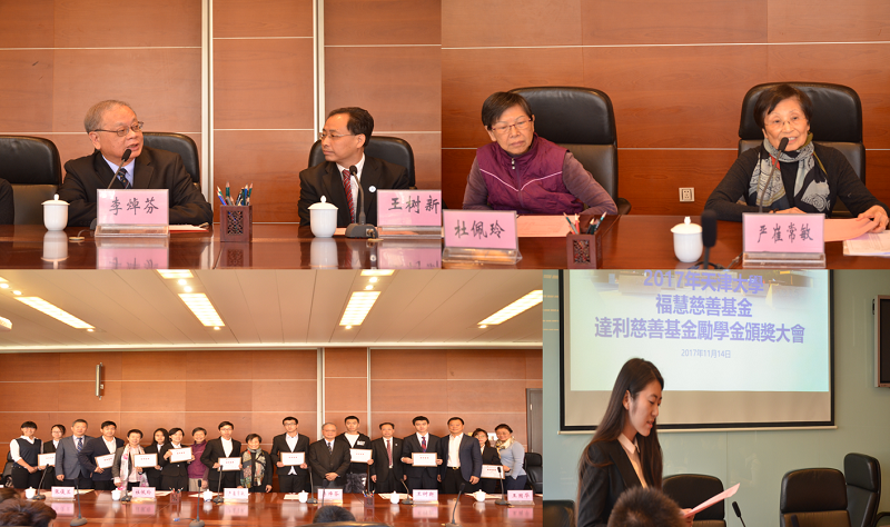 本站讯(通讯员 宋畅)11月14日,天津大学2017年“福慧慈善基金、达利慈善基金励学金”颁奖大会在卫津路校区会议楼第一会议室举行。中国工程院院士李焯芬,福慧慈善基金会主席严崔常敏、董事杜佩玲,天津日报社资深记者张俊兰,天津大学党委常委、副校长王树新,北洋教育发展基金会理事、神州泰岳软件股份有限公司创始人、首席战略官、知名校友王国华先生携夫人栾奕女士,北洋教育发展基金会秘书长潘峰、常务副秘书长潘晓睿出席会议。会议由学工部副部长马德刚主持。