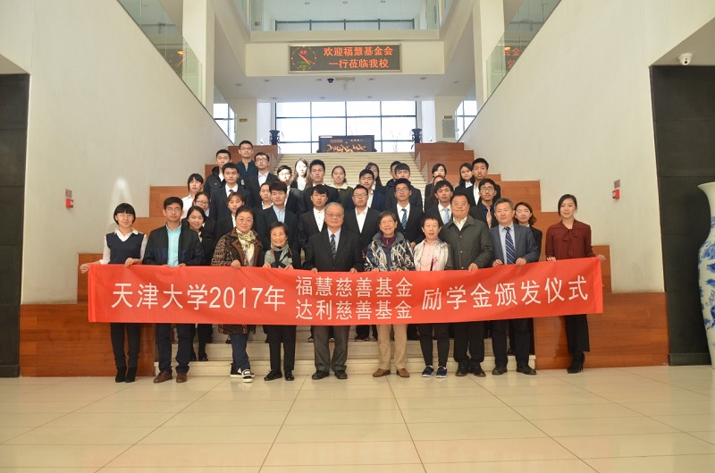 天津大学福慧爱心社社长、软件学院2015级本科生谢娟同学介绍了爱心社过去一年在内部建设、社会公益、提升素质等方面开展的工作和取得的成绩以及后续工作计划。马德刚介绍了福慧慈善基金、达利慈善基金在学校设立福慧励学金的背景、渊源和今年的评审情况并宣读了获奖学生名单。参会的来宾和领导为同学们颁发了证书并合影留念。获奖学生代表、化工学院2015级本科生靳津在发言中讲述了自己在学习竞赛、社会实践、学生社团等方面取得的优异成绩,表达了对福慧慈善基金、达利慈善基金的感谢和不断进取的决心。