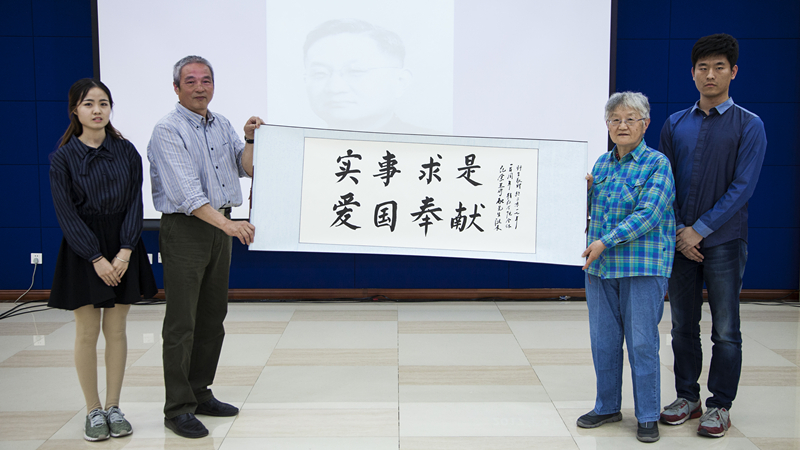 学生代表学院全体师生向王守融先生的家人敬献书法作品“实事求是、爱国奉献”