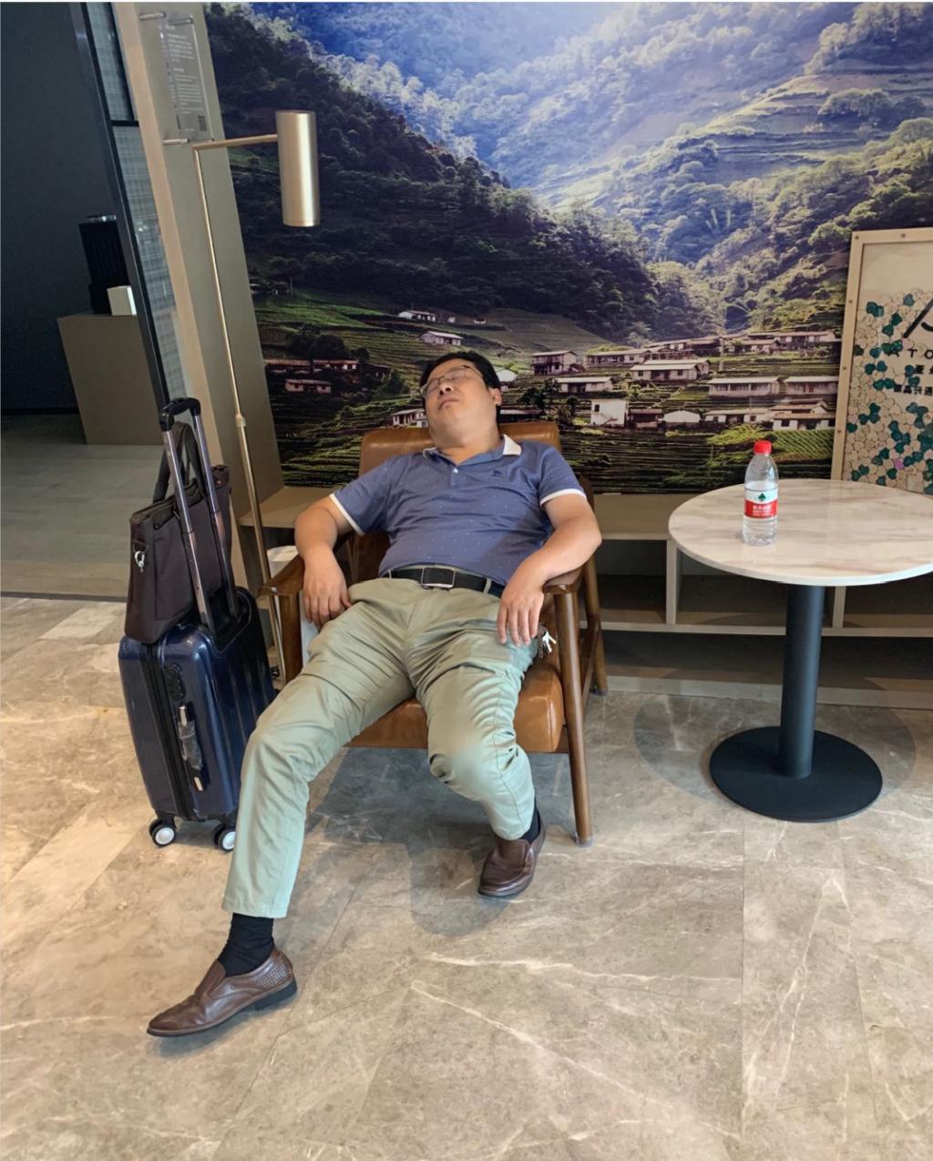 去年刚刚博士毕业的梁行手机里存着几张王老师生前珍贵的照片。其中一张拍摄于2020年9月11日中午。恰逢教师节期间,王老师带着课题组的几位学生去青岛出差,为了高铁行业材料准入标准设定与相关部门负责人开会讨论对接。结束了当天上午的讨论,就在梁行在前台办理退房手续的短短几分钟时间,他转身看到了已经仰在沙发上睡着了的王老师,并用手机拍下了这张照片。