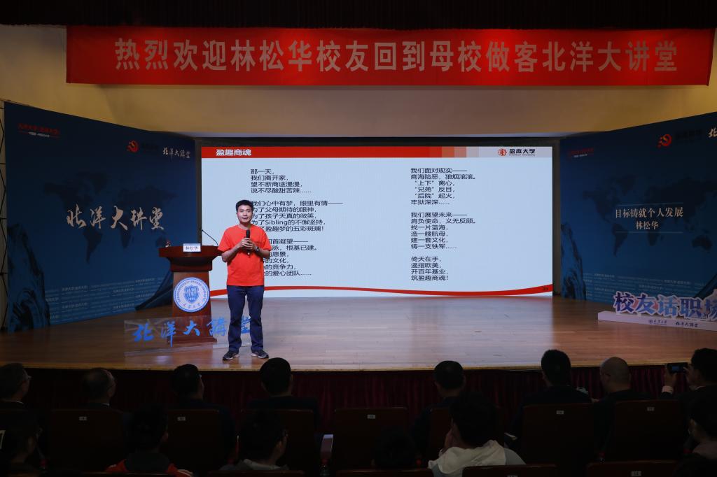 讲座结束前,林松华深情地吟诵了盈趣公司兄弟姐妹文化(sibling)商业团队凝聚力建设的抒情诗,总结自己事业的过往与梦想,并希望学弟学妹能够感受到目标的重要意义,为国家和民族做更多事。