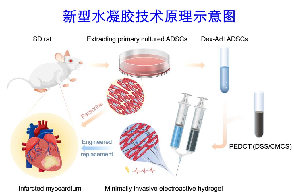天津大学李俊杰教授团队研发的新型水凝胶可有效克服传统导电水凝胶生物相容性差的缺陷,具有优越的细胞相容性和组织相容性,几乎不会引起炎症。特别值得一提的是,这种新型水凝胶还显示出与心肌相匹配的机械性能和传导性,能促进心肌细胞成熟和定向肌节结构的形成,可以调节纤维化引起的电解耦,防止梗塞恶化。实验结果显示,新型水凝胶可以有效延长干细胞治疗的持续时间,改善心脏修复功能。