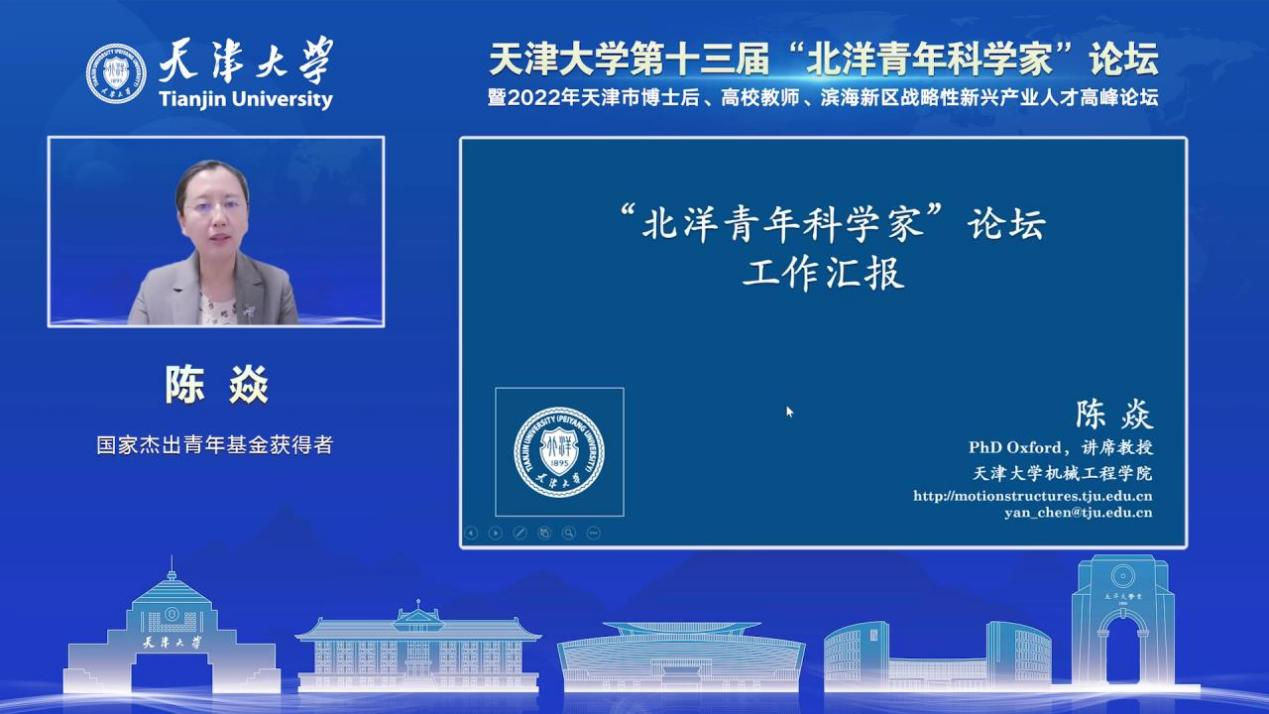 开幕式特别邀请了国家杰出青年基金获得者陈焱,她向海内外青年人才分享了过去十年在天大的工作情况,从人才项目、学术任职、学科服务、科技奖励与社会服务等方面总结了在天大工作获得的成果。她特别指出,在天津大学内部就可以开展很好的交叉学科研究,学校十分重视青年学者的引进与培养,在空间、项目/资金、人员等方面为人才提供了大力支持。诚挚欢迎海内外青年学者们加入天津大学的大团队中!