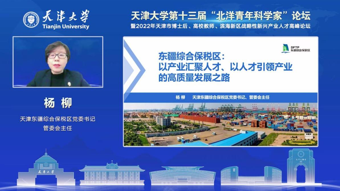 天津大学优秀校友、天津东疆综合保税区党委书记和管委会主任杨柳介绍了东疆综合保税区以产业汇聚人才、以人才引领产业的高质量发展之路。杨柳从东疆保税区的发展历程及历史沿革、产业发展与经济结构、产品人才融合发展等方面进行全方位介绍。她表示,东疆坚持党管人才原则,大力实施人才强区战略,做优做强人才“引育留用”生态链,激发区域创新创造活力,重点围绕三大主导产业、五大主题园区建设,着力打造产业人才高地,走出一条产业链与人才链深度融合的高质量发展道路。欢迎广大青年人才来到东疆,扬帆起航!