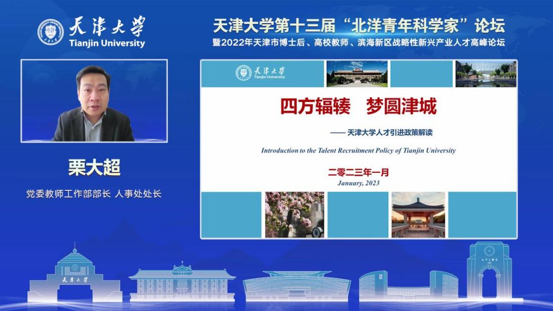 本站讯(通讯员 俞霞)2023年1月8日,第十三届“北洋青年科学家论坛”暨2022年天津市博士后、高校教师、滨海新区战略性新兴产业人才高峰论坛在“云端”顺利开幕。本次论坛开幕式设置了亚太美加专场与欧洲专场,来自全球各地千余名青年学者齐聚云端,在国际前沿科学技术领域开展研讨,促进青年学者的学术交流与合作。同时也增进各位青年人才对天津大学、天津市高校及天津市、滨海新区及东疆港保税区的认识和了解。