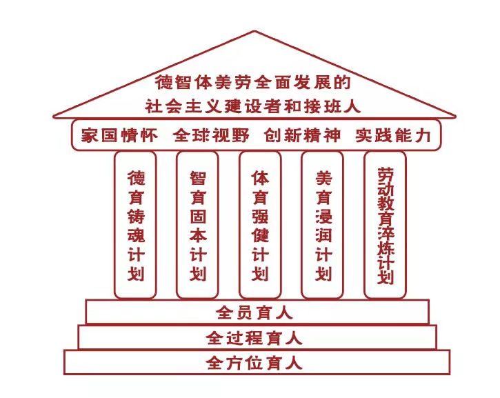 2019年,天津大学设计了一栋“育人的大厦”,并浪漫地这样描述它:“屋顶”是中央的要求,培养德智体美劳全面发展的社会主义建设者和接班人;“四梁”就是天津大学的人才培养目标,培养“家国情怀、全球视野、创新精神、实践能力”的卓越人才;“八柱”就是德育铸魂计划、智育固本计划、体育强健计划、美育浸润计划、劳动教育淬炼计划等一系列攻坚计划;“地基”就是以强化全员育人责任,抓好全过程育人环节,营造全方位育人环境为基础保障。同时,这座大厦还需要有阳光,那就是教师对学生的爱和责任。