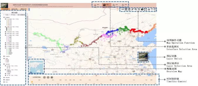系统将长城本体分为长城墙体、界壕壕堑、墙上单体、墙外单体和其他设施子目录,并应用不同的颜色和符号区分建筑类型,便于公众对不同的设施有更明确的意识,不至于产生混淆。另外,系统统一坐标系,可以进行各时期图片、地图定位显示,启用“时间轴”,则可显示各时期军事聚落空间分布,使得公众对于长城的时空性有更清晰的认识。