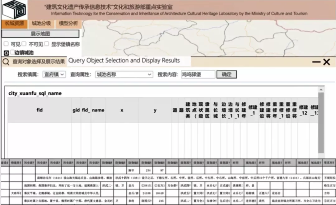 另外,该系统提供时空信息查询、显示和编辑功能。对于某段长城的具体信息可以通过查询获得,其中可查询信息包含——地理信息:地理位置、行政区划、现状级别、隶属区段、与长城的位置关系、边墙长度、与长城的距离;历史信息:修建时间、重修时间、修建将领、历史演变;聚落、建筑形制信息:平面形状、南城垣、北城垣、东城垣、西城垣、周长、占地面积;墙体形制信息:堡墙、堡门、瓮城、马面、角楼;街巷空间信息:街巷、建筑。公众可以依据自己的研究或兴趣点进行相关的查询,基本可以获得较为详尽的具体信息。