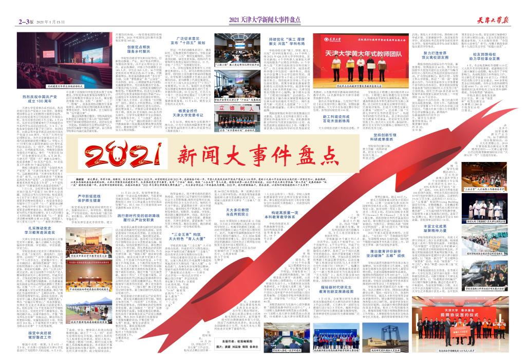编者按 新元肇启,华章日新。转眼间,历史的车轮已驶入2022年。回首刚刚过去的2021年,是持续奋斗的一年,中国人民热烈庆祝中国共产党成立100周年,党的十九届六中全会让我们进一步坚定信心、振奋精神,以更加昂扬的姿态奋进新征程。天津大学隆重庆祝建党百年,扎实推进党史学习教育,发布“十四五”规划,构筑“三全五育”育人大厦,持续向世界一流大学目标迈进。2022年是天津大学实施“新三步走”发展战略和“双一流”建设的关键一年。在这辞旧迎新的时刻,本报如约推出“2021年天津大学新闻大事件盘点”,与大家分享过去一年的喜悦与荣耀。2022年,我们将继续奋斗,勇往直前,以实际行动迎接党的二十大召开!