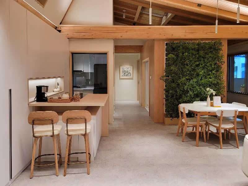 它看上去就像一座绿植环绕、造型独特的小木屋。屋顶一反常态,由两块大小不一、角度不同的顶板拼接弯折而成。进入建筑内部,简洁的智能化家居让空间感更足;“三室两卫”各有特色化的功能设计足以满足全家所需。