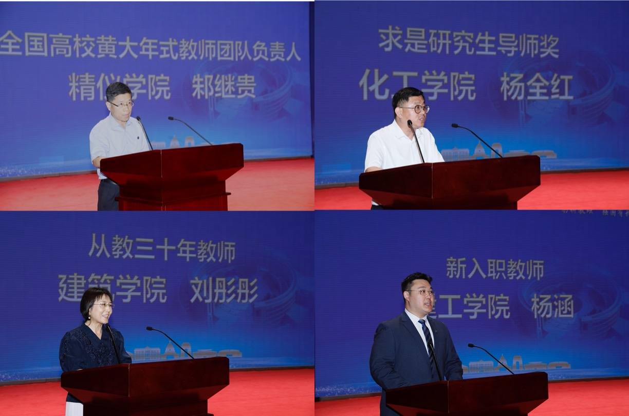 在教师代表发言环节,“全国高校黄大年式教师团队”负责人精仪学院邾继贵老师表示,黄大年精神一直感染并不断激励团队全体成员始终以振兴国产仪器行业为己任,而“做对国家有用的科研,做创新的科研”也是团队始终坚持和不断传承的信念。“求是研究生导师奖”获奖代表化工学院杨全红老师回顾了17年间课题组的发展历程,点点滴滴生动展现了感性的“求实”和理性的“求是”是流淌在天大人血脉中的精神密码。从教三十年教师代表建筑学院刘彤彤老师以“传承”“奋斗”“热爱”为关键词分享了她三十载永葆教育初心的漫漫师者路。新入职教师代表建工学院杨涵老师以“感恩”“笃行”“律己”为切入点,表示作为教育工作者,会始终与时代同向同行,永远把国家发展和人民幸福作为自己的首要任务。杏坛三尺、甘做孺牛,四位教师代表的发言生动展示了天大教师将全部精力和满腔热情献给崇高的教育事业的无悔追求。