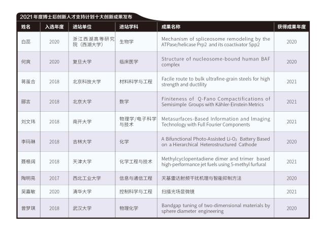 为进一步树立博士后创新典范,全国博士后管委会办公室、中国博士后科学基金会开展了2021年度博士后创新人才支持计划十大创新成果遴选工作,经单位推荐,共有北京大学、清华大学、上海交通大学、复旦大学等82家设站单位的博新人员提交了270个成果,其中高水平论文234项、奖励25项、专利2项、其他9项。经专家评审,遴选出了十大创新成果(排名不分先后)。天津市此次共有两名博士后入选,分别来自天津大学、南开大学。