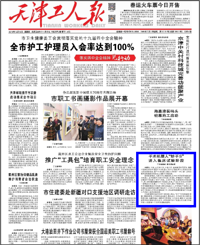 天津工人报讯(记者 秦帆 通讯员 赵辉) 日前,由天津大学、中南大学、威高集团共同研发,湘雅三医院负责的中国国产手术机器人“妙手S”临床多中心研究正式进入临床试验阶段,国产手术机器人离进入市场仅“一步之遥”,这标志着我国高端医疗装备自主创新又有新突破。