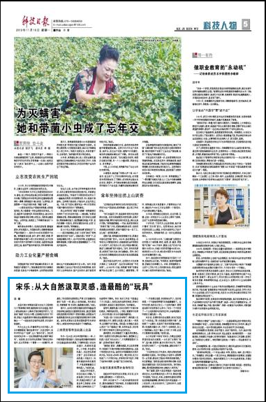 作为土生土长、听着相声长大的天津人,宋乐的幽默感是“融在血液中的”,交谈过程中,他时不时抖出个“包袱”,让人“措手不及”。宋乐把他的研究方向——仿生智能看作是生物界“模仿秀”。他觉得,自己的研究成果除了要有应用价值外,还必须具备一个要素——一定要好玩、有意思。“我没把研究想得那么严肃,它们就像研究者的‘玩具’一样,要让人觉得有趣。用天津话说,我要做最‘哏’的研究,搞最酷的发明。”他说。