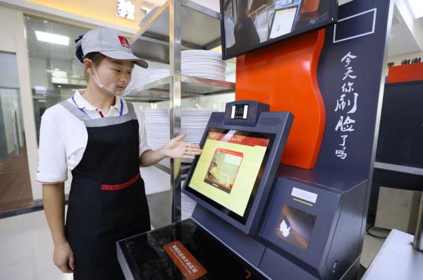 江苏镇江,在江苏大学京江学院第二食堂,一名工作人员展示无感支付设备